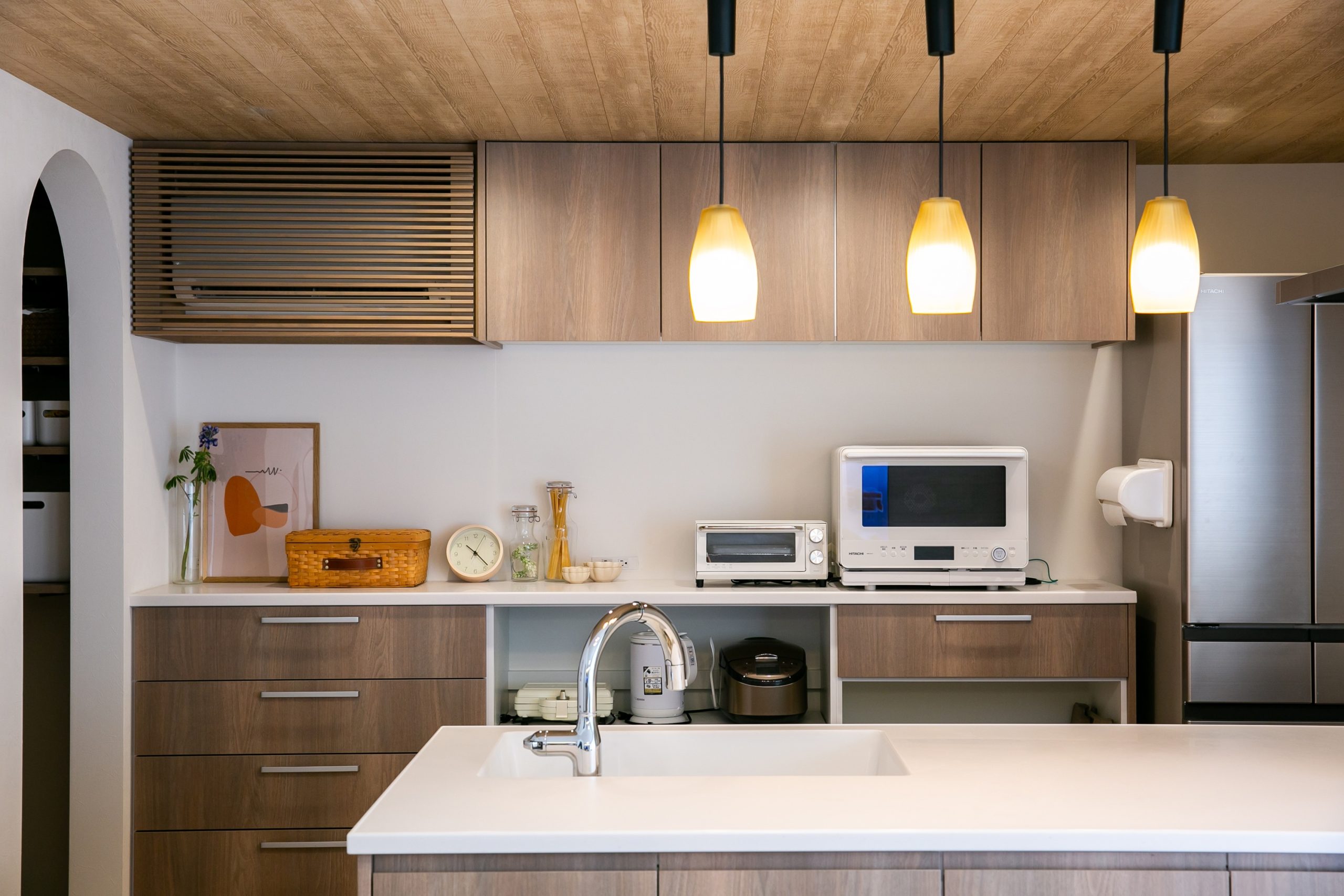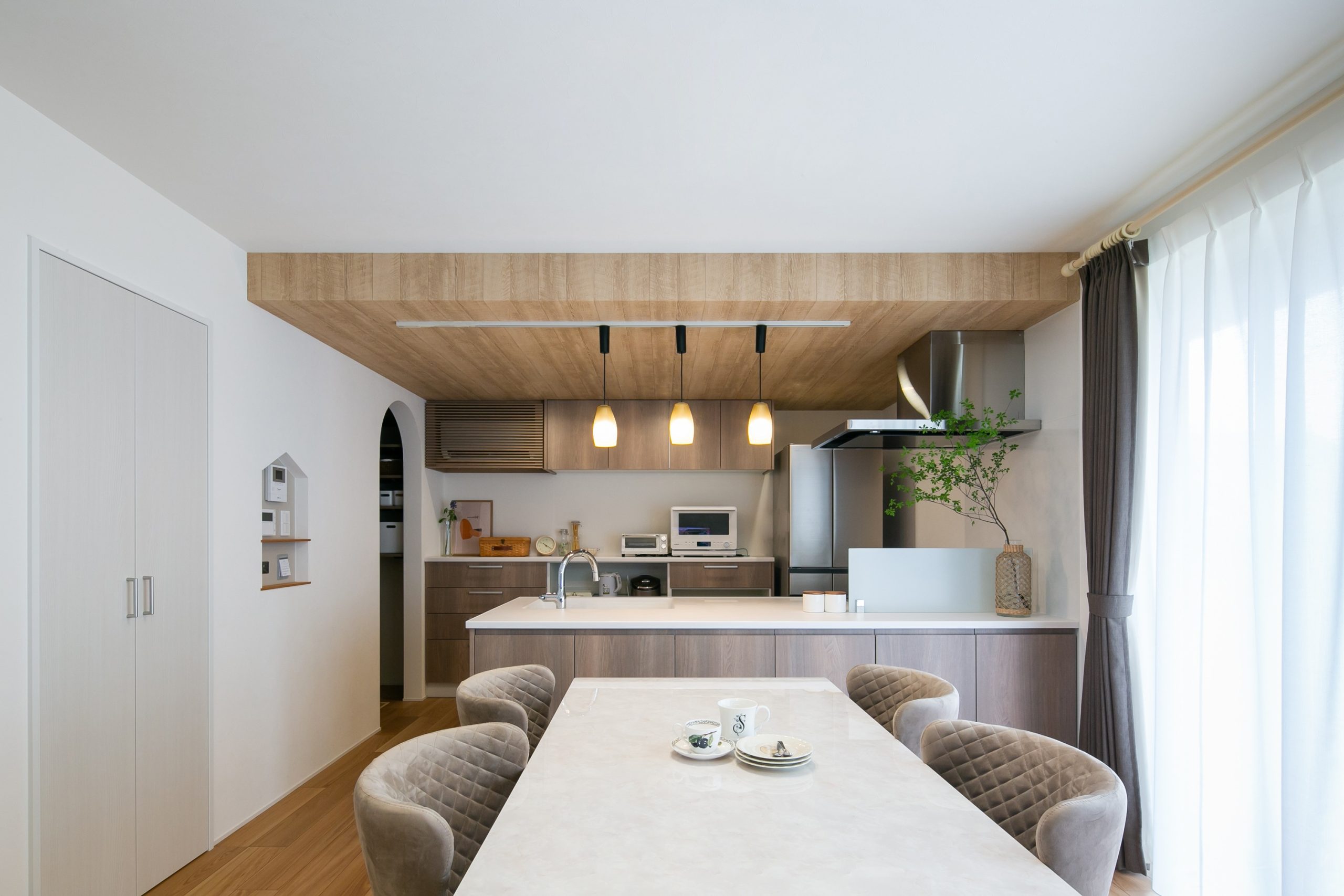 下がり天井や、木目のクロスを取り入れたこだわりのキッチンスペースは