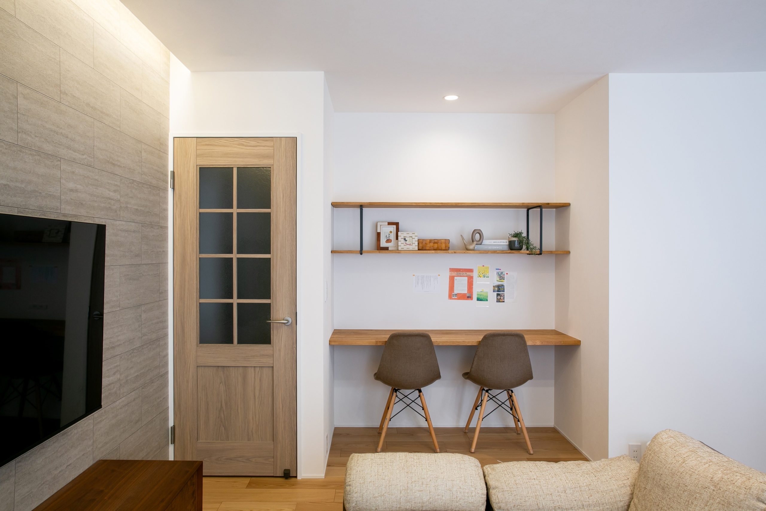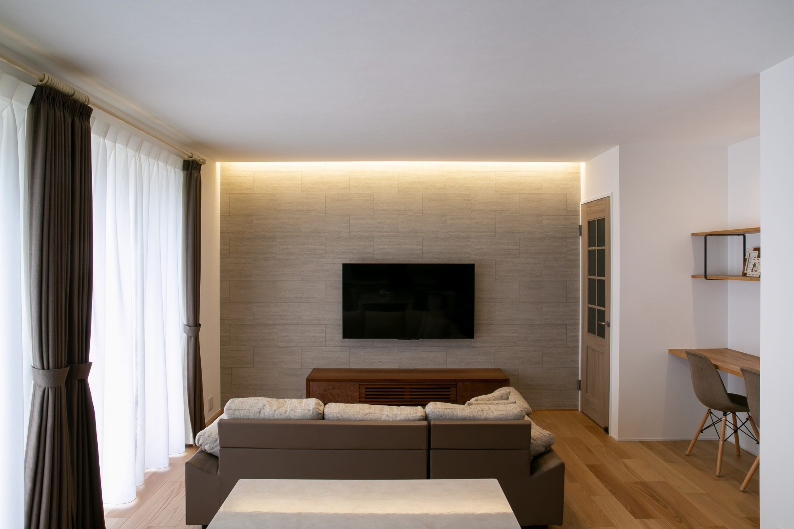 そんなご要望から、テレビ背面にはベージュ色のタイル調クロスを選定。
