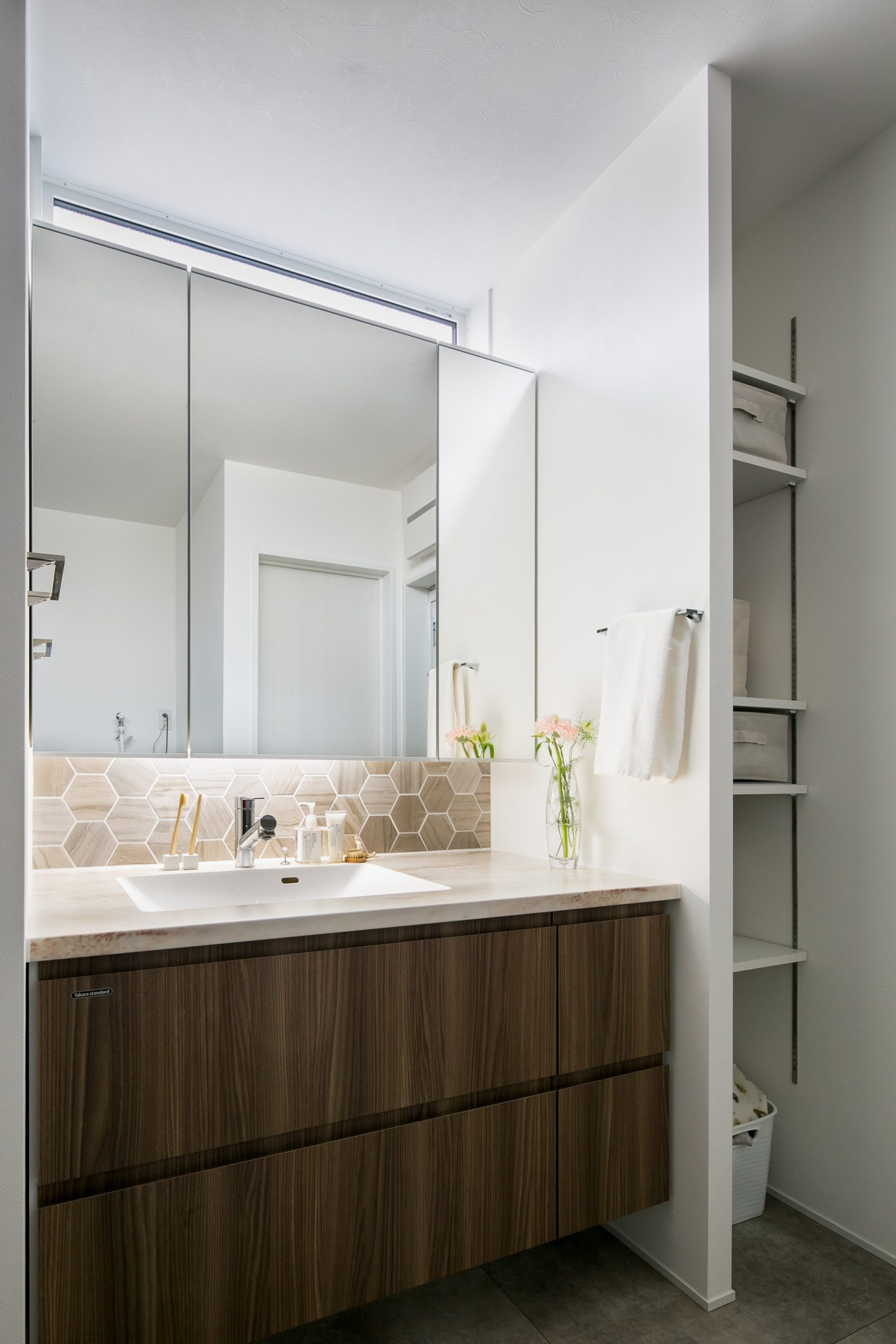 洗面コーナーは、3面鏡で大容量収納が可能に。