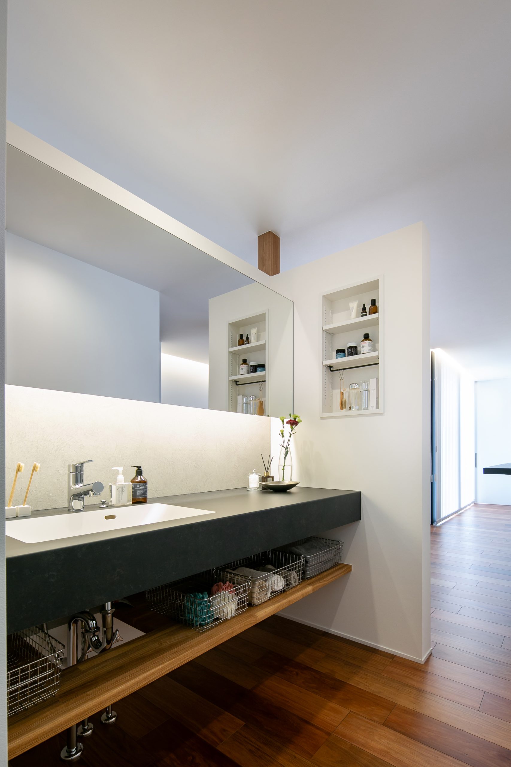 扉をあえて控え奥行き感を演出した設計にすることで、より広く感じられる空間となった。