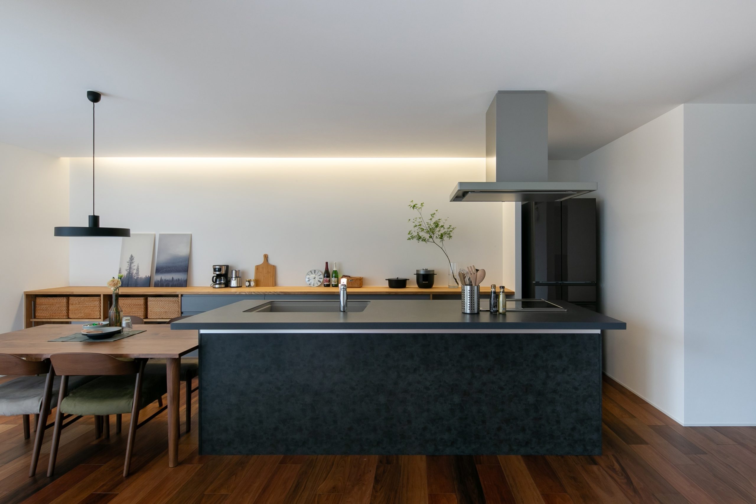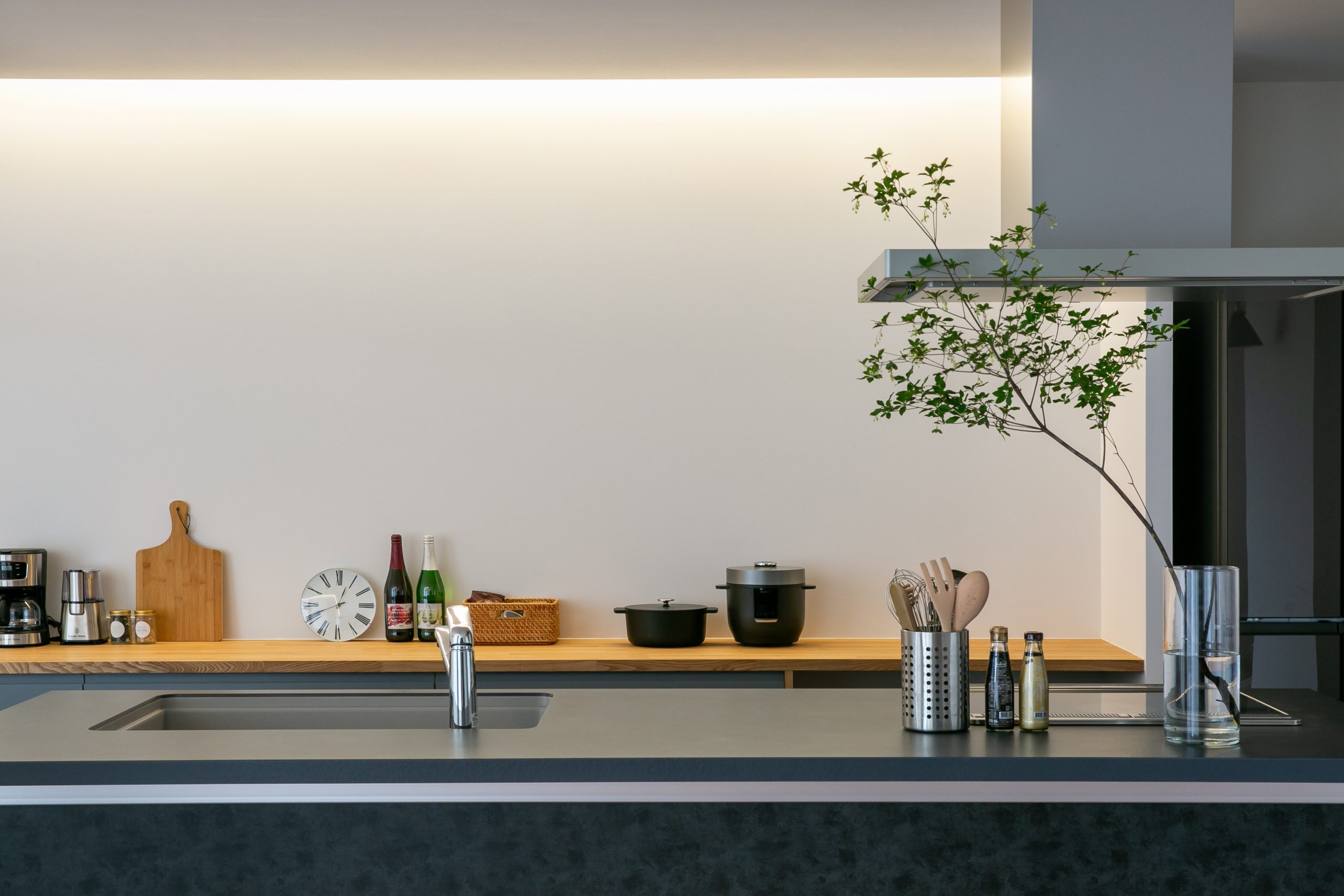 間接照明が映えるように、あえて飾り棚を設置せずきれいな壁を残した。