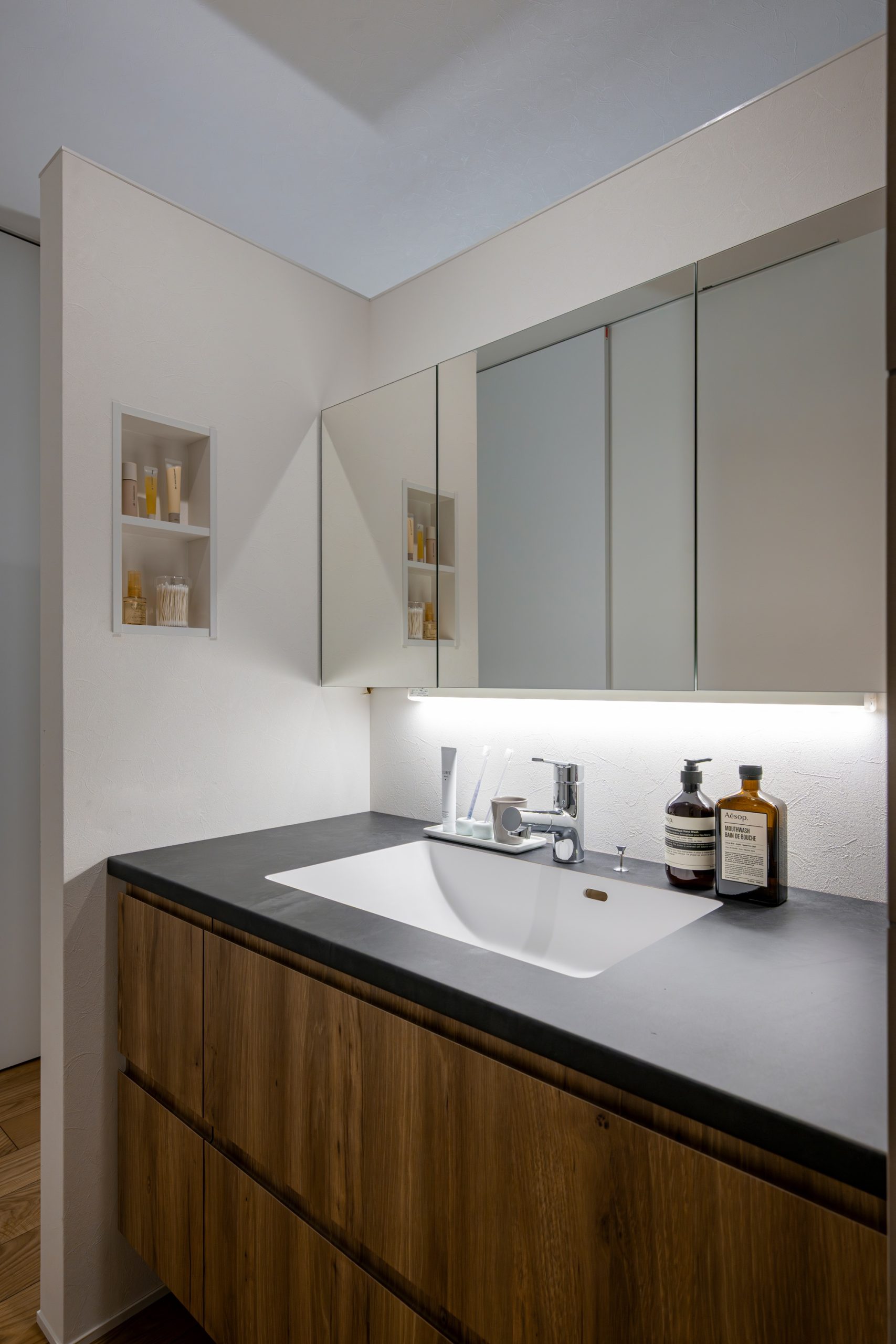 ニッチや三面鏡があるので、収納たっぷりな洗面となった。