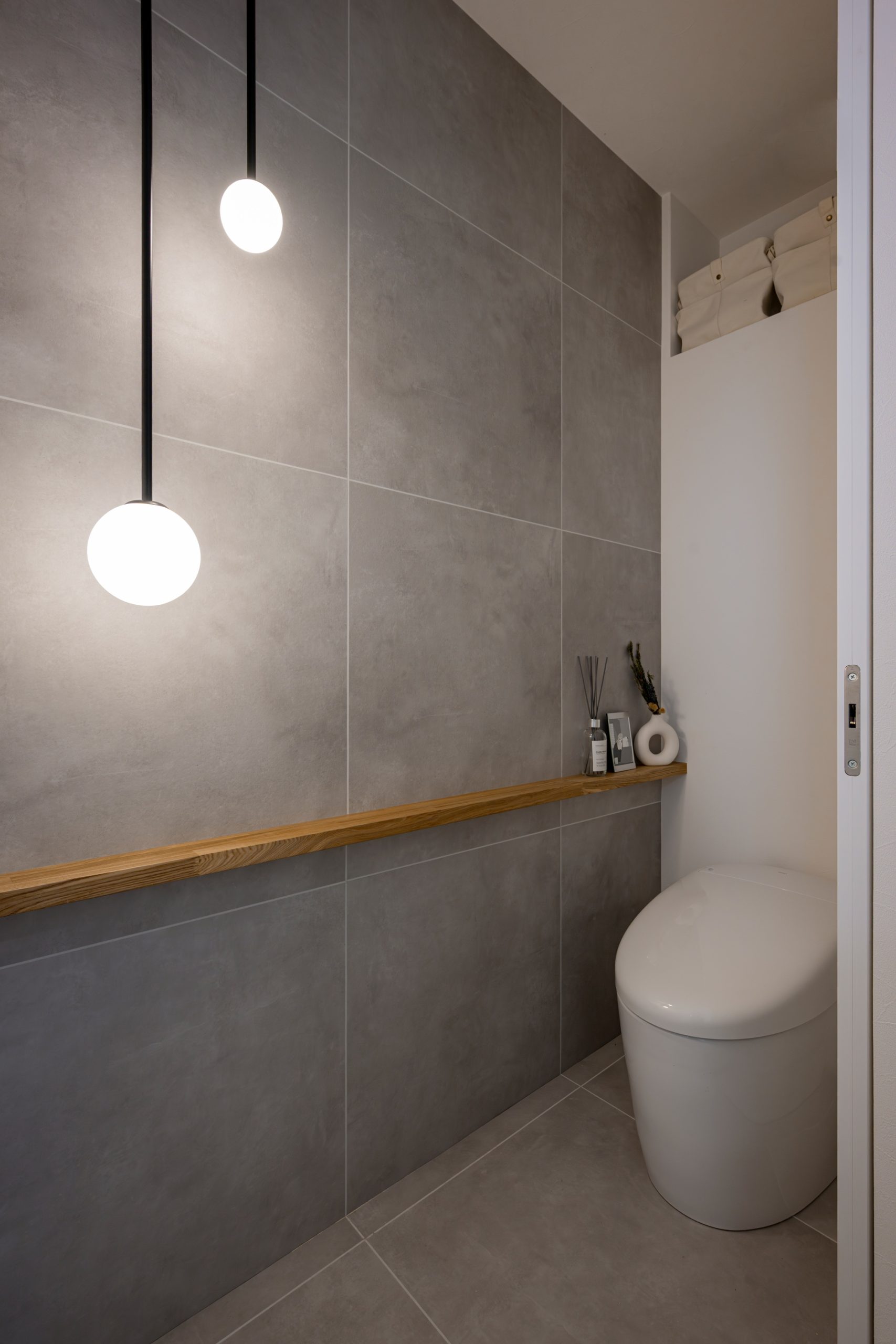 空間を引き締める壁面のタイルや遊び心ある海外製の照明を使用して、