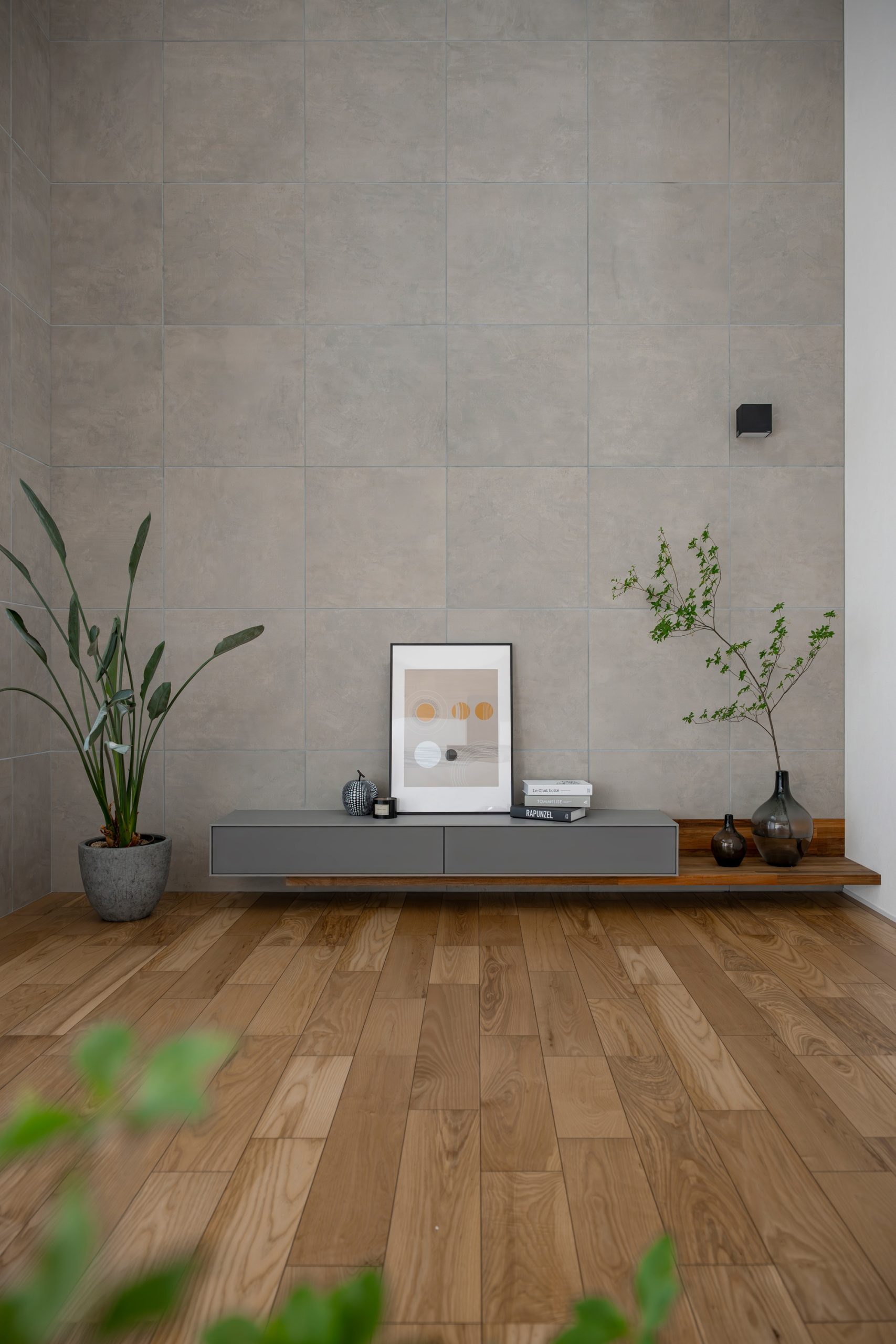 テレビ背面は大判タイルで圧巻の仕上がり。