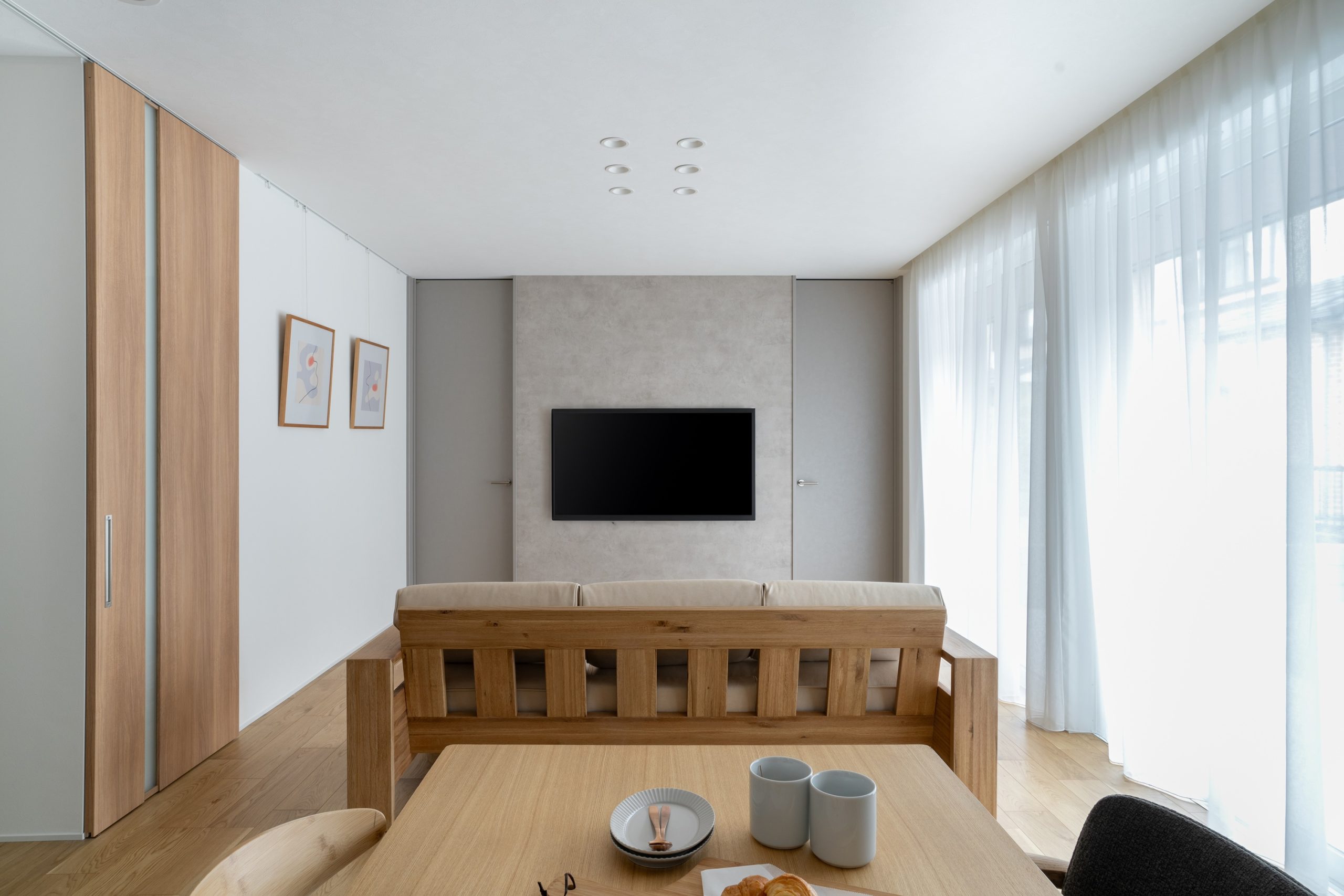 直線美が際立つファサードに、木の温もりを取り入れたデザイン。