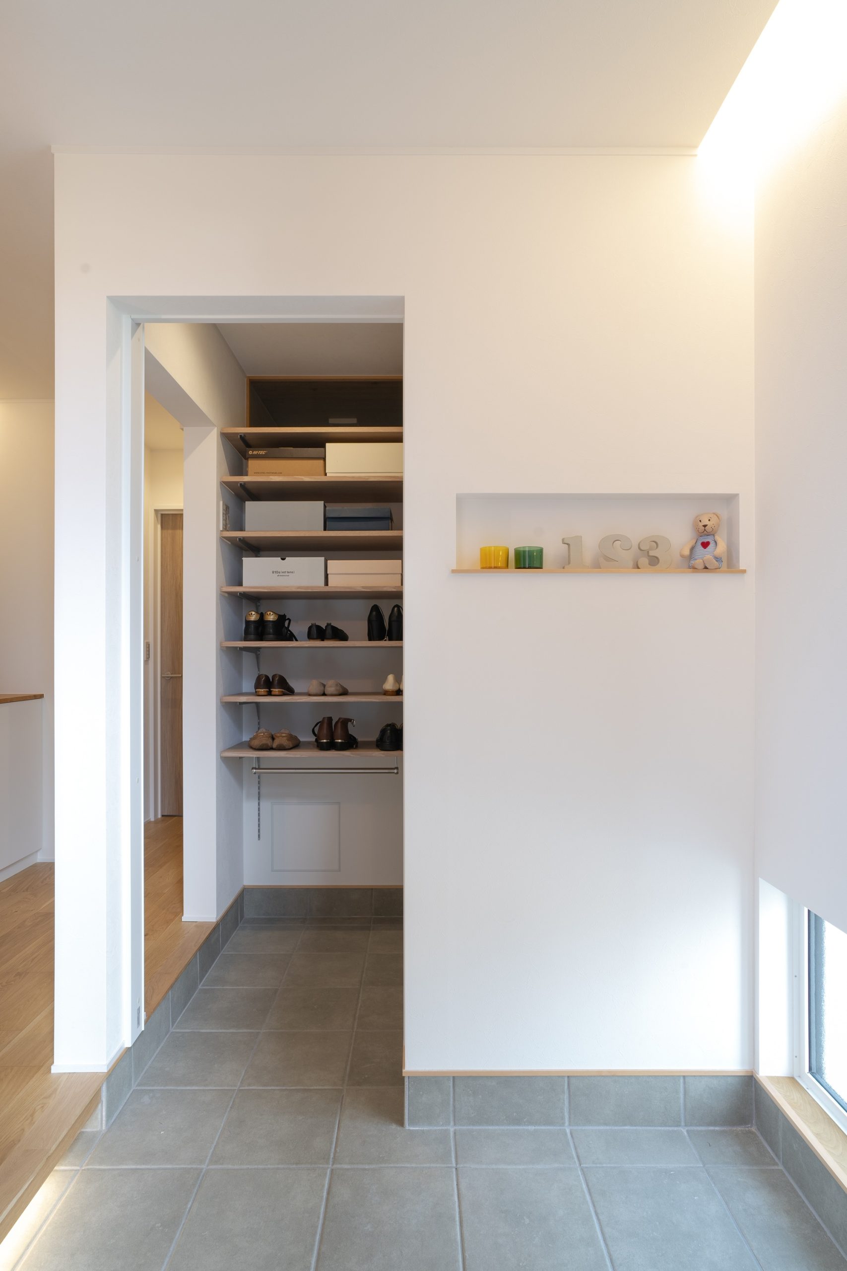 開放感ある玄関を抜けると、暮らしやすい動線が広がり光と風が心地よく巡るよう設計。