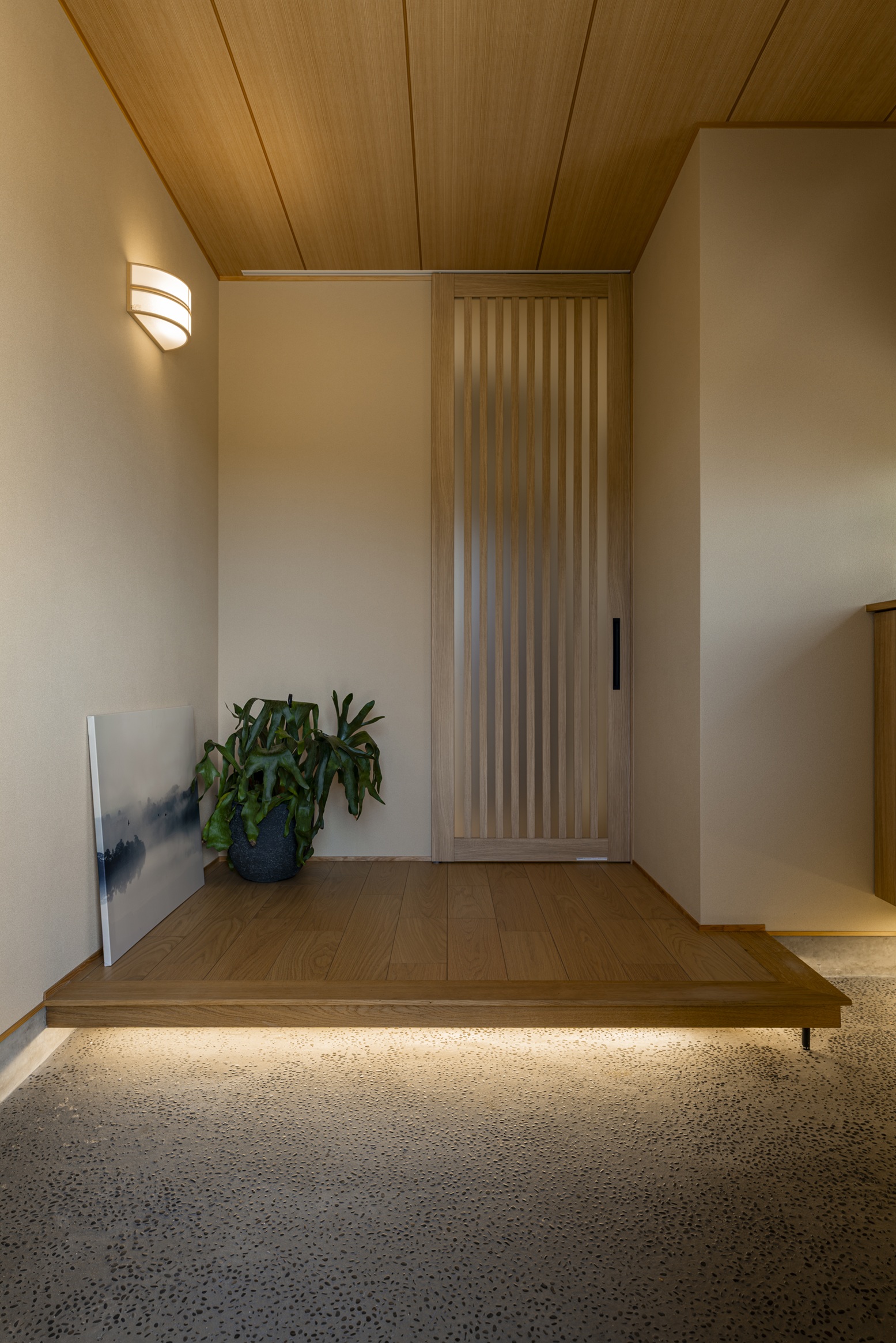 洗い出しの素朴な質感に、間接照明の柔らかな光を添えた。