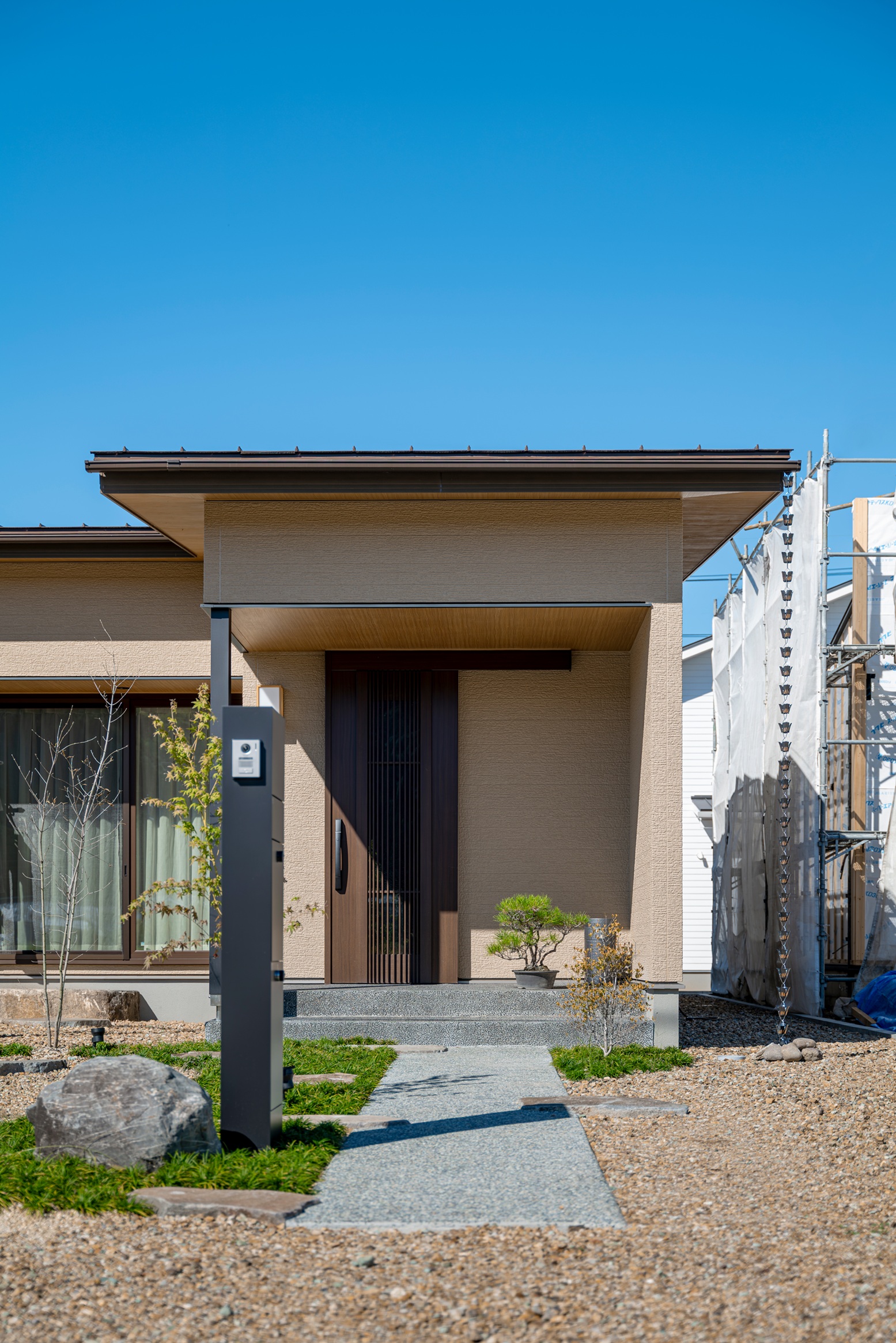 外観、内装ともにベージュトーンと木目で統一、照明や建具、樋など細部までこだわりぬいた心安らぐ和モダンなお家が完成した。